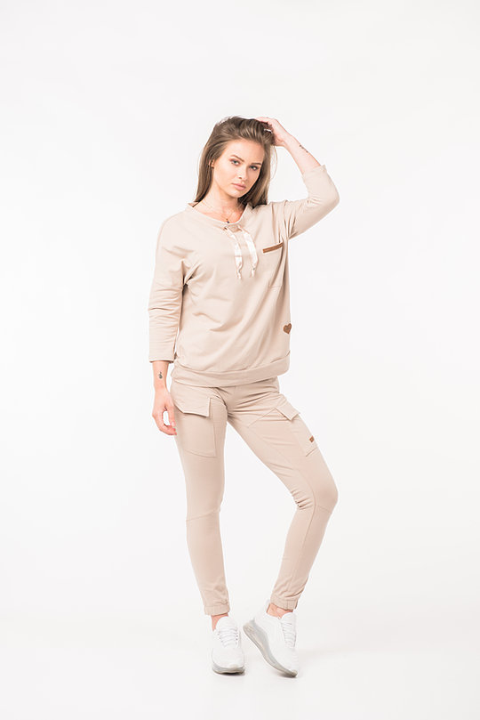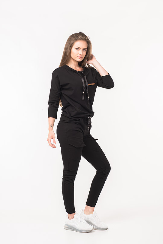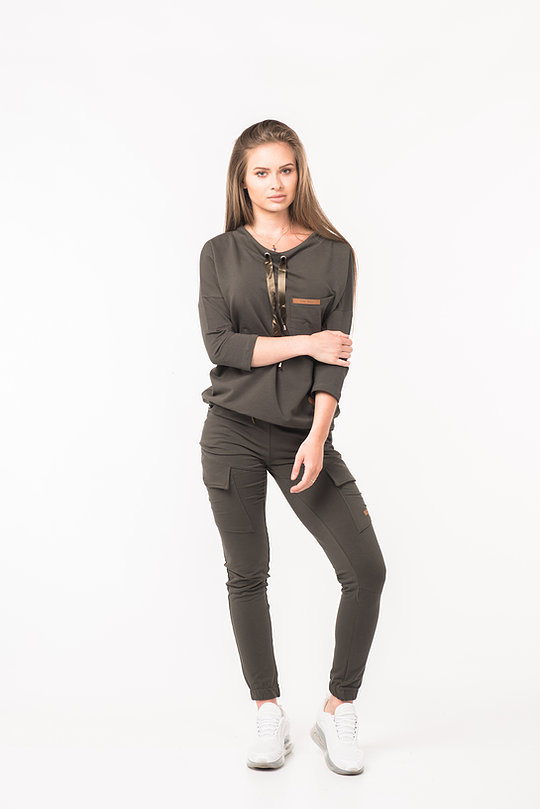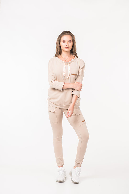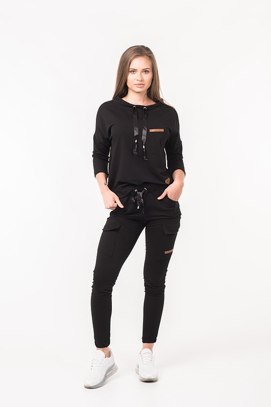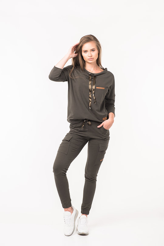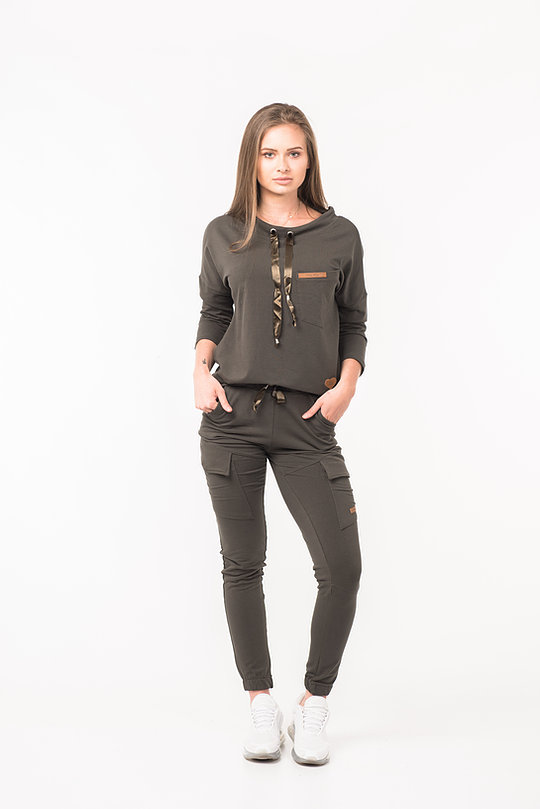 Komplet dresowy damski dwuczęściowy powinien znaleźć się w każdej damskiej szafie. Sprawdzi się na co dzień, na wyjście ze znajomymi . Komplet składa się z bluzy z troczkiem przy szyi i spodni. Bluzę oraz spodnie można nosić razem lub osobno, co daje nieskończenie wiele możliwości stylizacyjnych. Łącząc bluzę z jeansami można stworzyć modny, casualowy outfit. Dodatkowo spodnie mają dwie kieszenie.