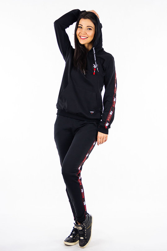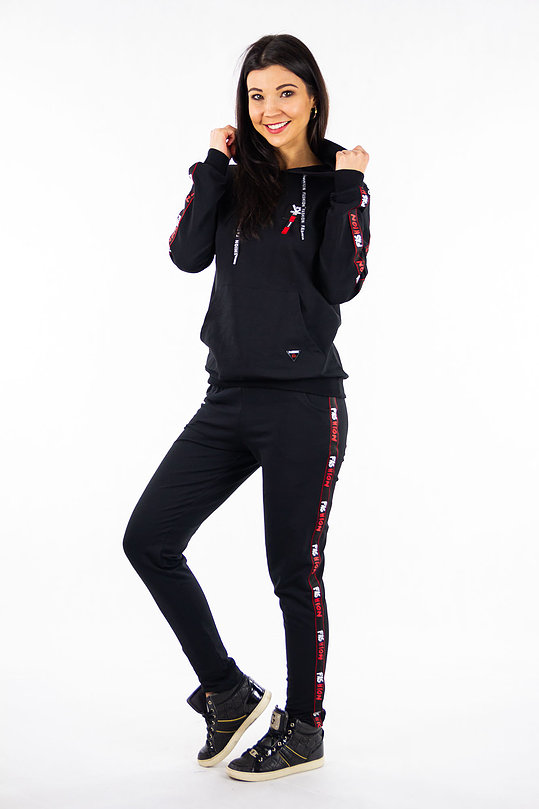 Komplet dresowy dwuczęściowy składający się z bluzy wkładanej przez głowę oraz spodni. Góra jak również dół kompletu wykończone zostały delikatnym ściągaczem. Spodnie na gumce regulowane dodatkowo troczkiem. Po bokach posiadają dwie kieszenie.
