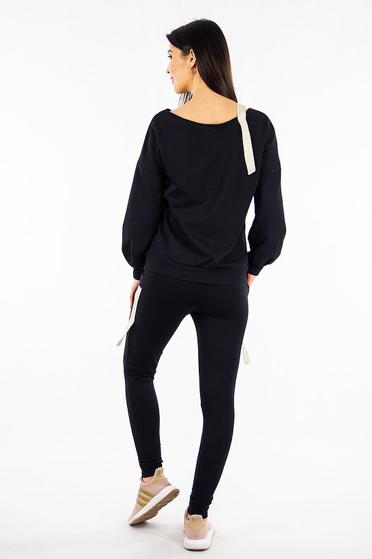 Komplet dresowy składający się z bluzy wkładanej przez głowę z taśmą na ramieniu oraz spodni. Góra jak również dół kompletu wykończone zostały delikatnym ściągaczem. Spodnie na gumce regulowane dodatkowo troczkiem. Po bokach posiadają dwie kieszenie, i taśmy na nogawkach.