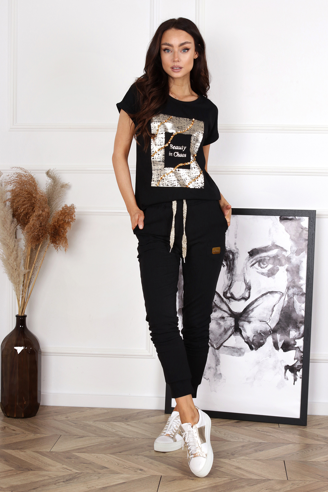 Spodnie w sportowym stylu wykonane z miękkiej dzianiny. Model regulowany w pasie złotym sznurkiem, dzięki czemu spodnie dopasowują się do każdej sylwetki. Prostotę fasonu przełamuje ozdobna złota blaszka.