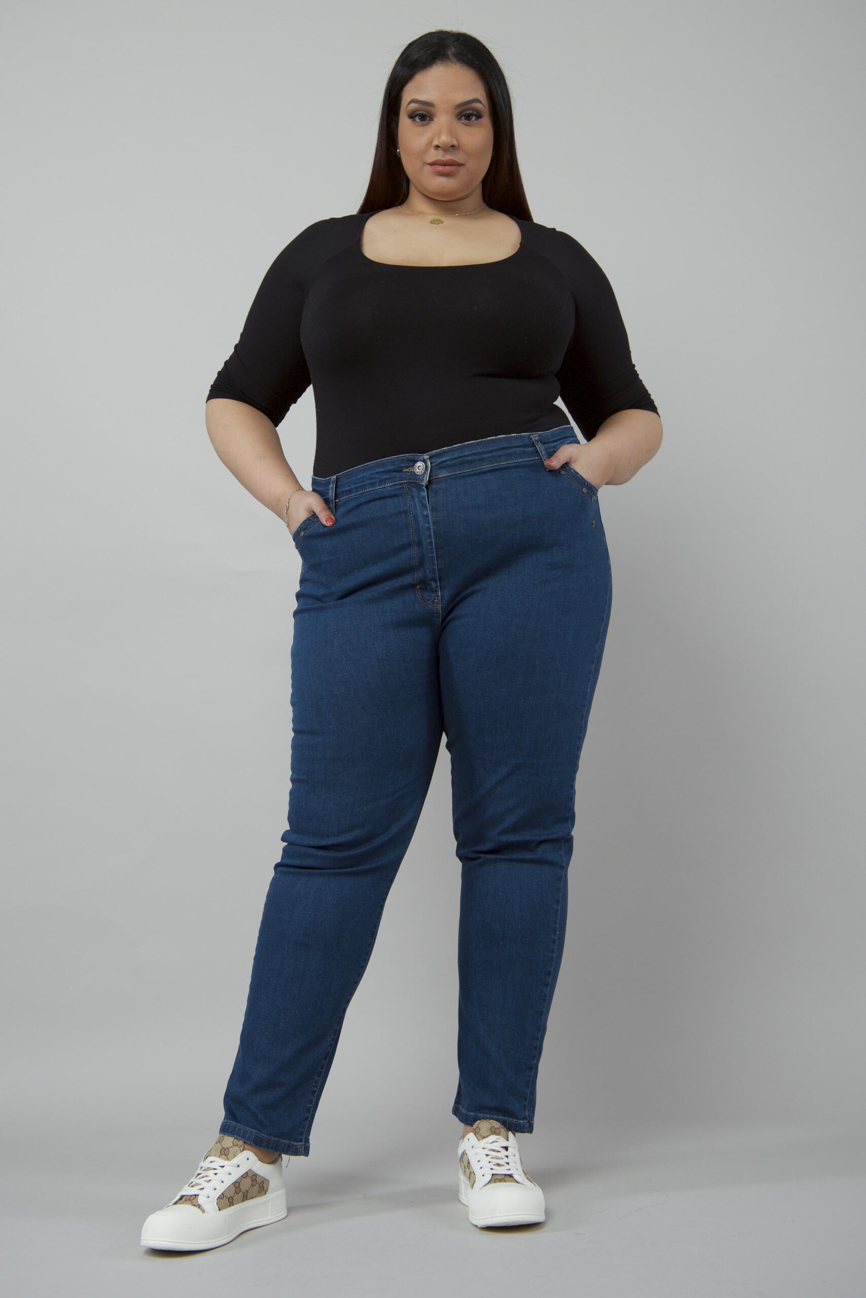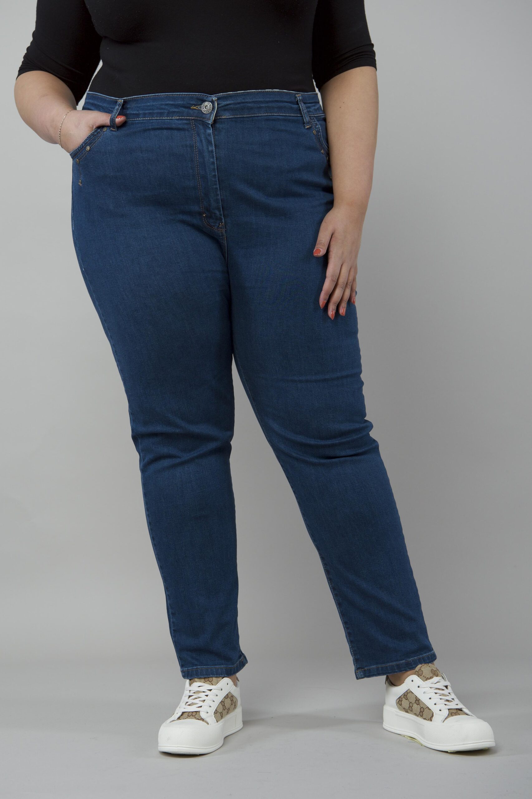 <div style="text-align: center;" data-mce-fragment="1" data-mce-style="text-align: center;"><span data-mce-fragment="1">Dopasowane Klasyczne Jeansy Plus size. Model z wysokim stanem. Z przodu i z tyłu wsuwane kieszenie.Zapinany na zamek</span></div>