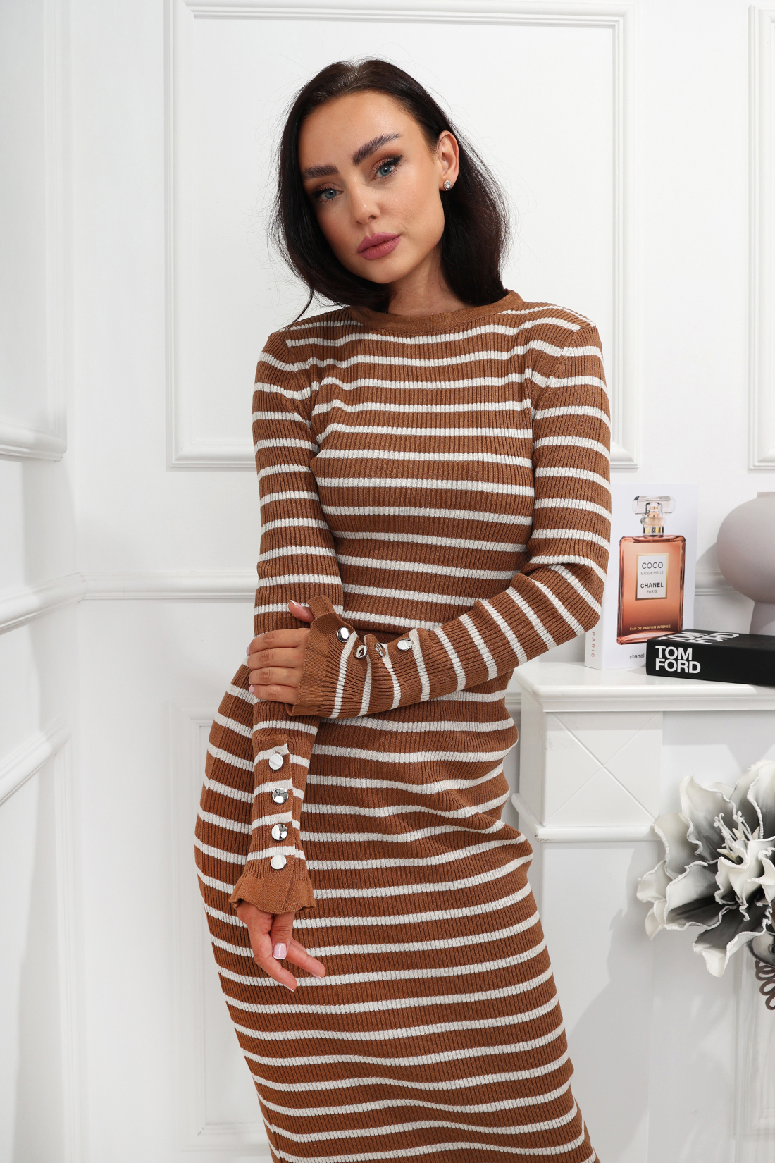 Dzianinowy komplet w niezwykle kobiecym wydaniu to propozycja, która świetnie sprawdzi się w każdej garderobie. Całość wyróżnia się pasiastym wzorem, ozdobnymi guzikami na rekawkach. Bluzka to model z długimi rękawami i okrągłym dekoltem. Dopasowana do niej spódniczka posiada gumkę w pasie, dzięki której perfekcyjnie układa się na sylwetce.