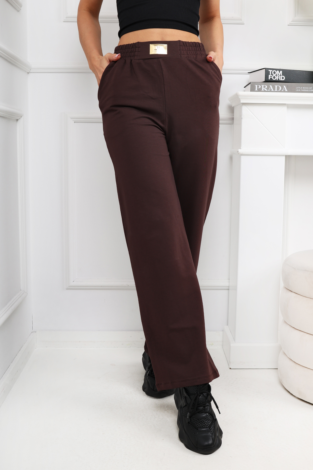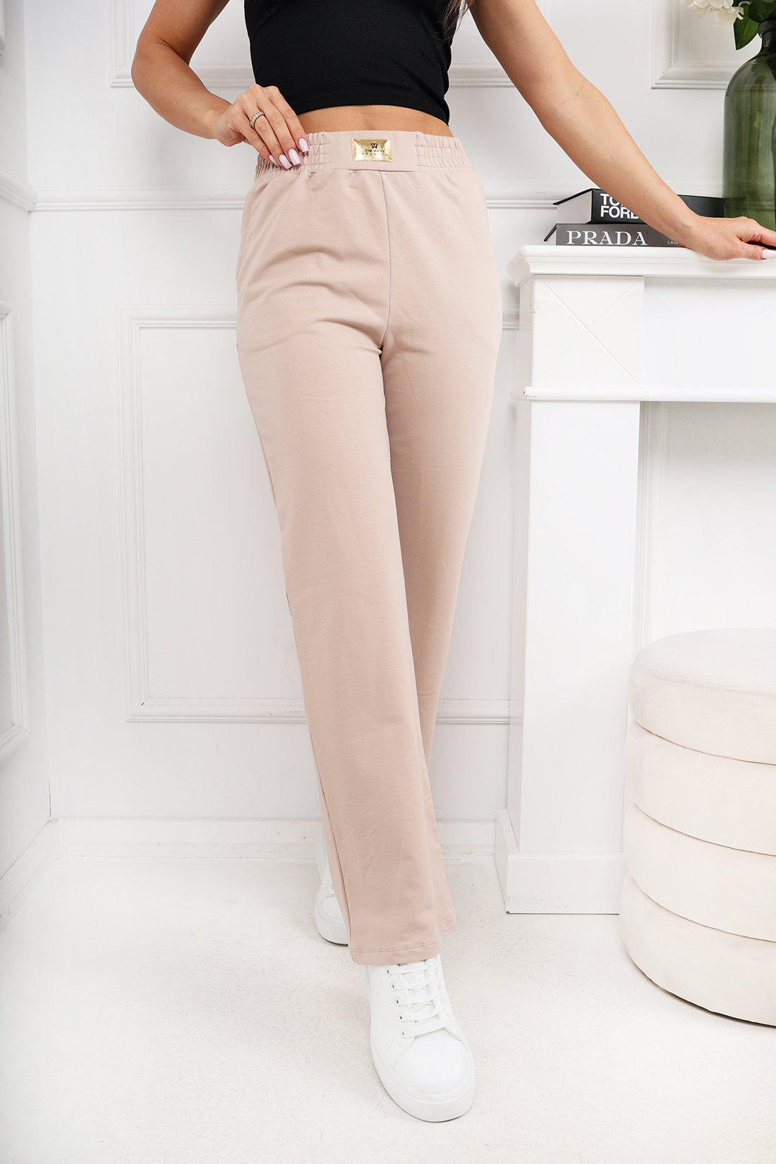 Bawełniane spodnie dresowe z rozszerzanymi nogawkami . To model z wysokim stanem, gumką w pasie z naszywką oraz kieszeniami z przodu. Skomponuj cały look wybierając spośród innych modeli na naszej stronie