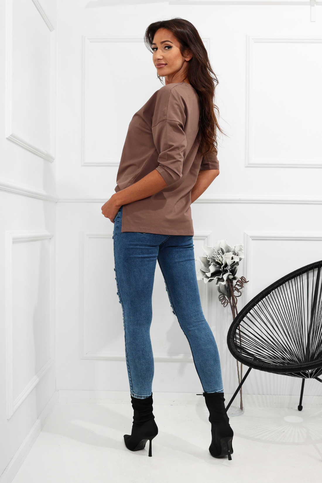 Jeansy z wysokim stanem, modnymi przetarciami to nieodłączny element każdej kobiecej garderoby. Zapinane są na suwak oraz guzik, posiadają kieszenie zarówno z przodu, jak i z tyłu. Doskonale zaprezentują się w lookach w codziennym wydaniu.